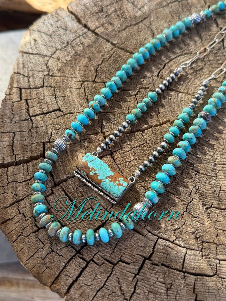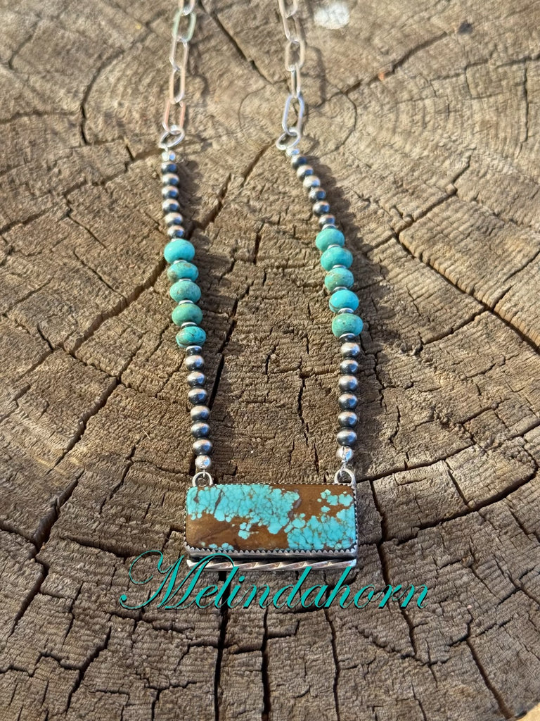 #8turquoise bar set in fine and sterling silver hung from sterling cow chain and Kingman and sterling antiqued beads. The chain makes it easy to shorten for that perfect stack. 20” tip to tip in length. Other beaded necklaces sold separately