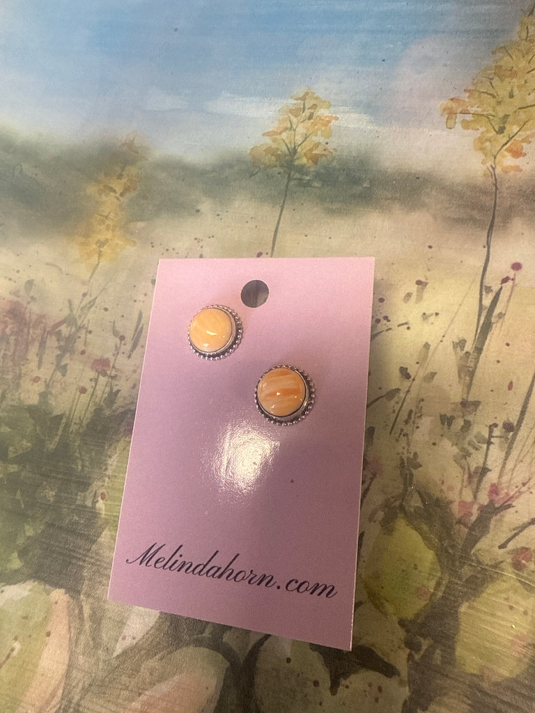Sterling silver fancy studs. Sterling silver settings with sterling silver posts. Stones are Mohave blue turquoise, Kingman turquoise, orange shell, red coral
