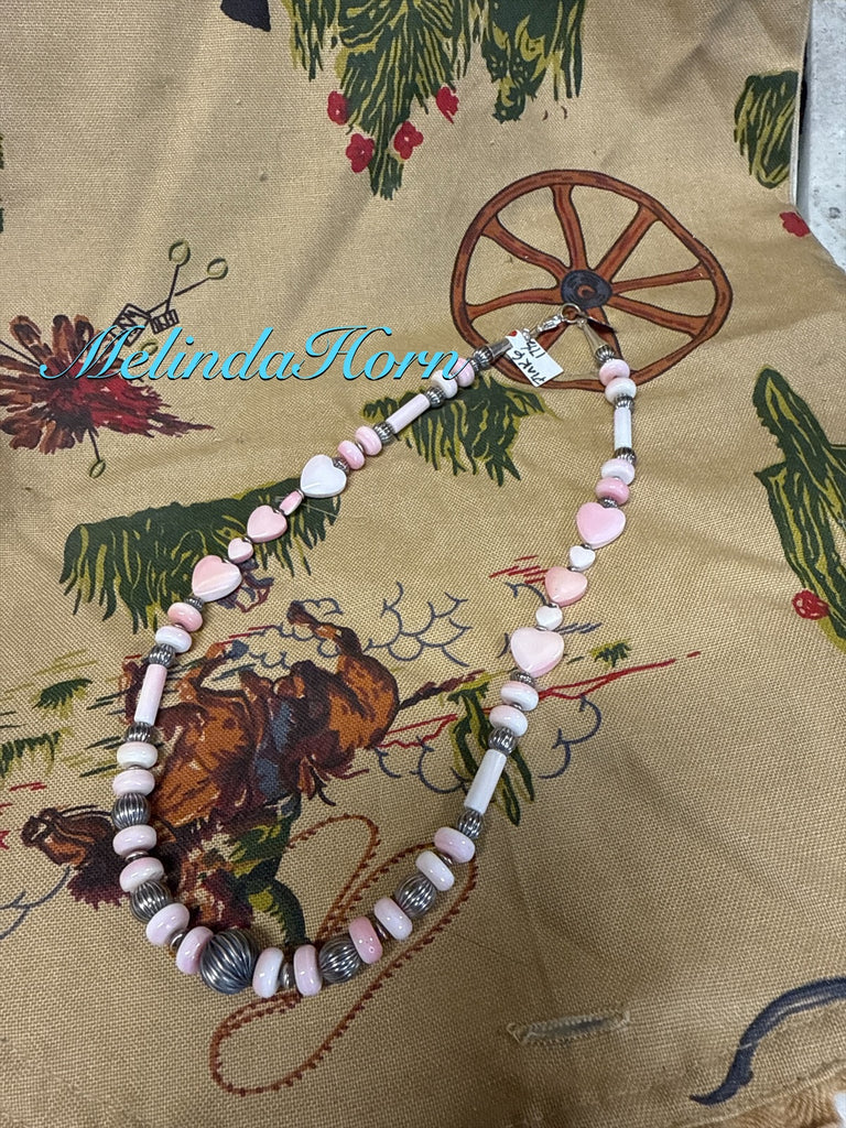 18” hand strung pink conch beads with Oxidated sterling beads. Lobster clasp.