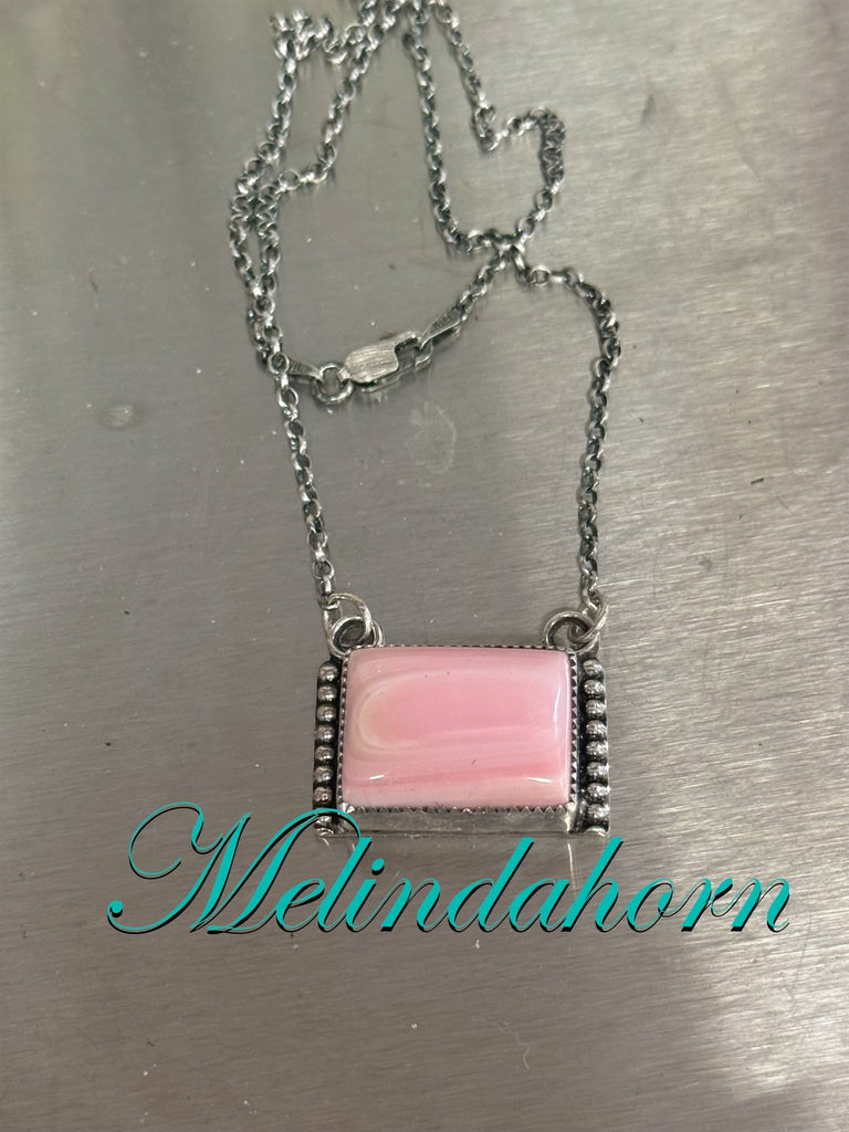 Deep pink color in this square Pink Conch bar necklace. Sterling and fine setting and 18” sterling chain.