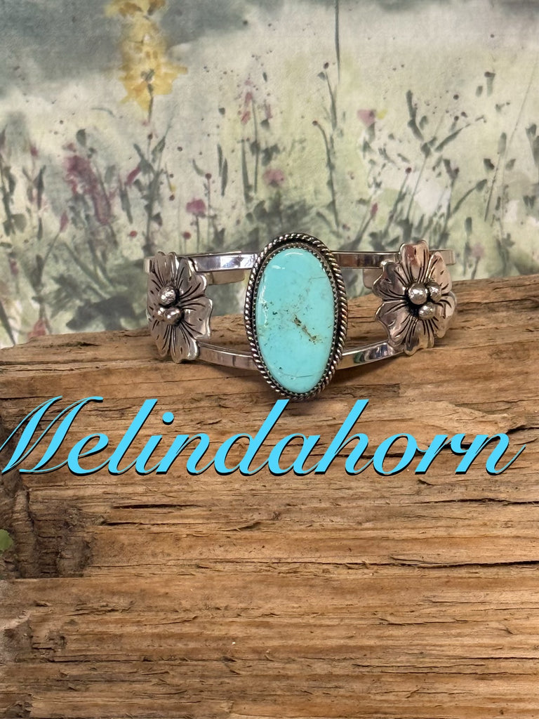 Pale blue turquoise set off this elegant sterling silver bracelet. It has sterling engraved Berry flowers and is 6” from tip to tip