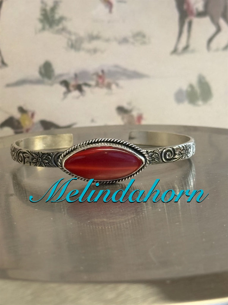 Pretty red Rosarita set in fine and sterling silver on a 6”, tip to tip, floral sterling bracelet.