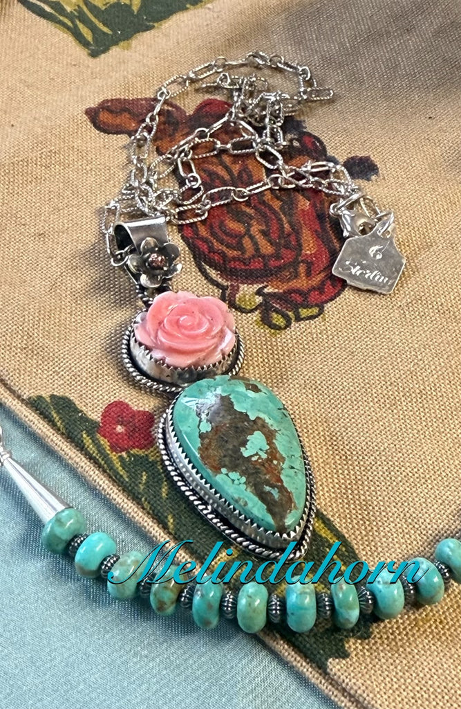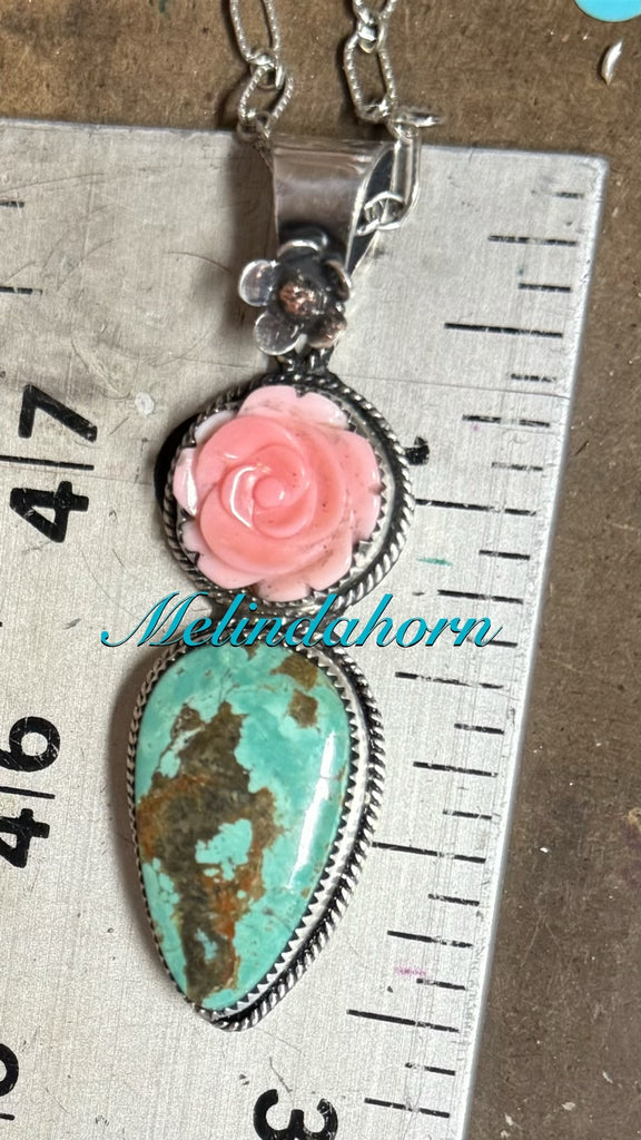 Tyrone turquoise and pink conch rose make this a statement Cactus Rose pendant. Set with fine and sterling silver. Bail accommodates 6 mm beads. Sterling chain is 18”.