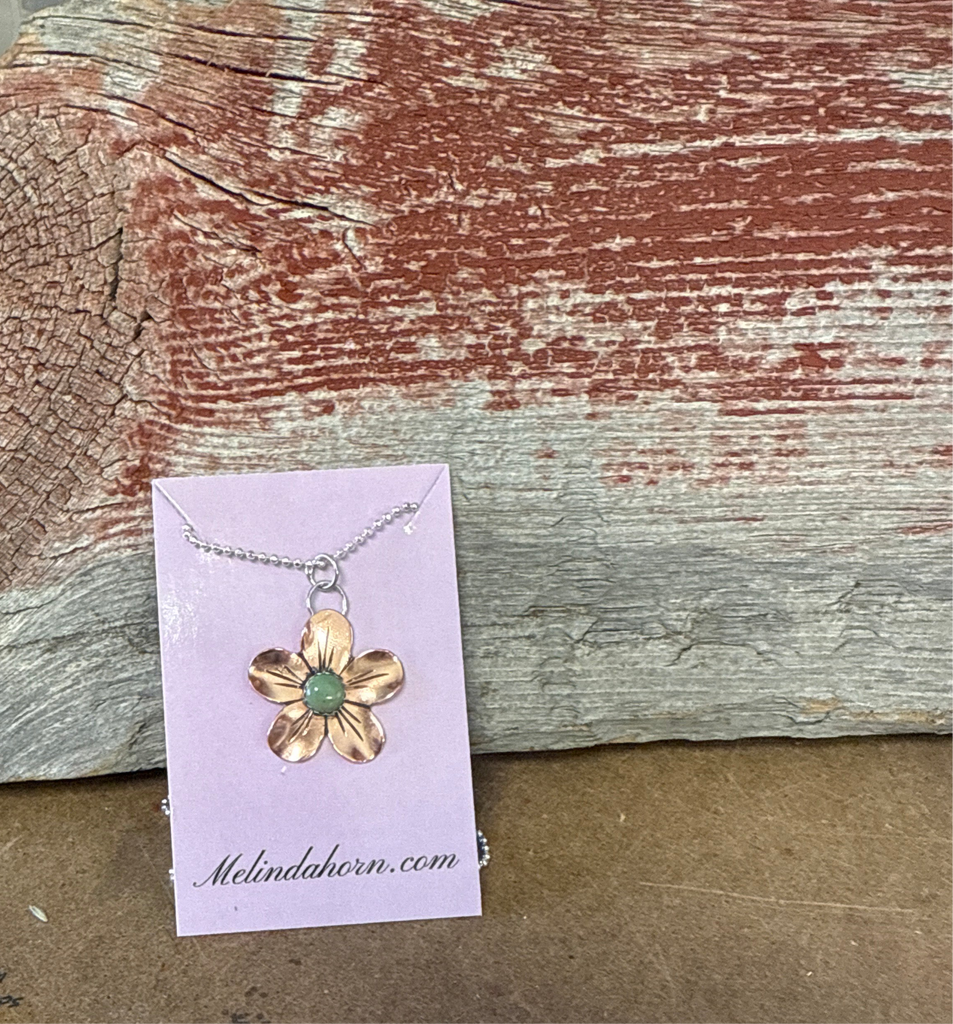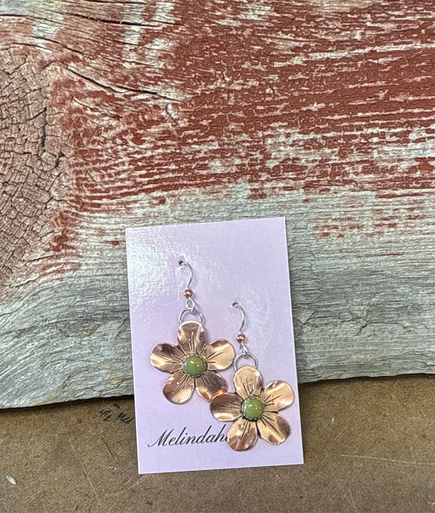 1” engraved copper MC Forget Me Not flower dangle earrings. Sterling silver ear wires. Sage Kingman turquoise