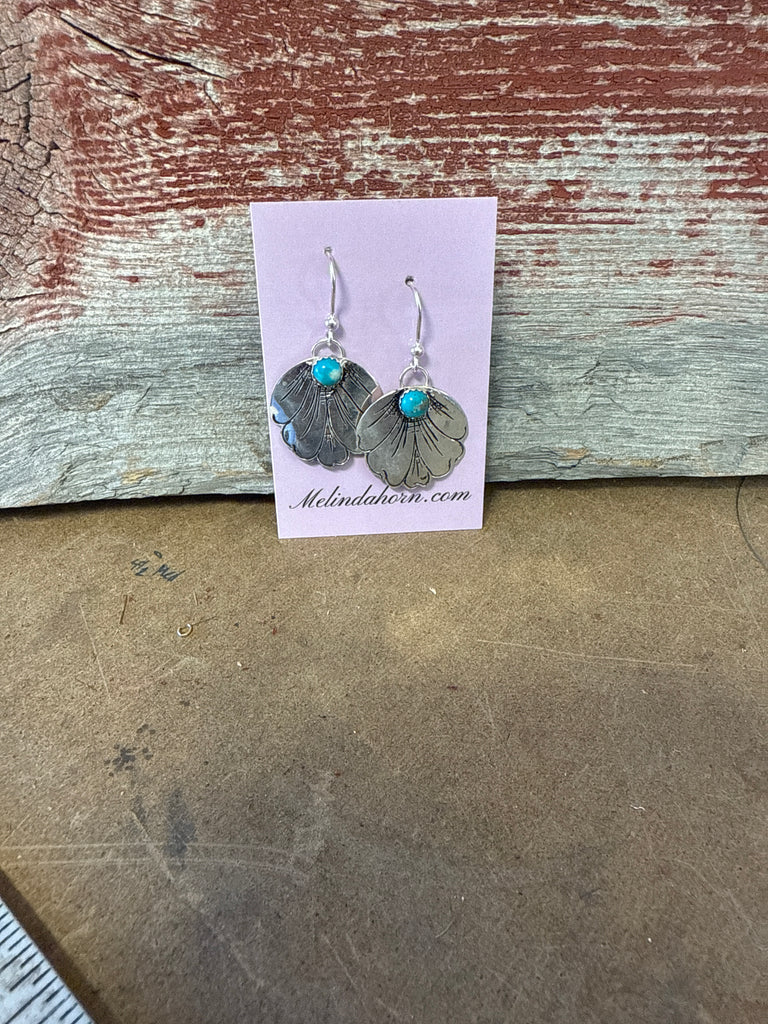 1” sterling silver engraved live edge petal earrings with orange spiny for a flower center. 1/2” sterling silver ear wires.