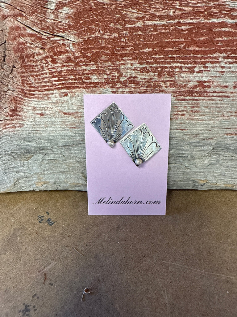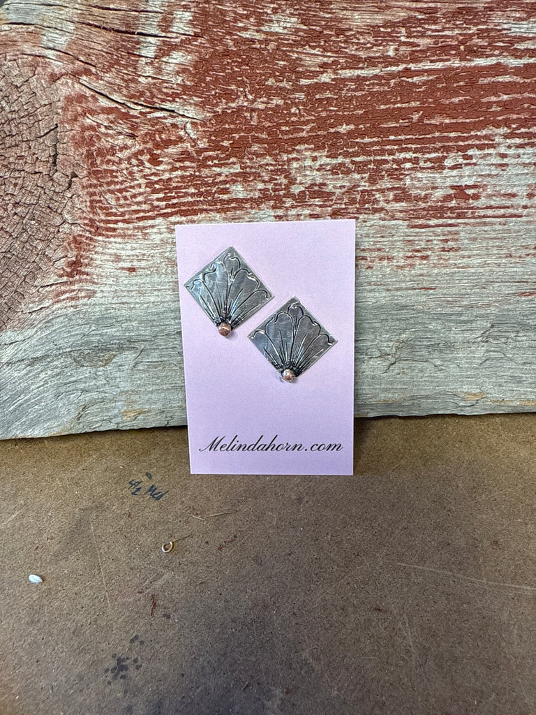 1” sterling engraved Mountain Petal earrings with copper accents on 1/2” sterling silver ear wires ear , Studs are sterling silver