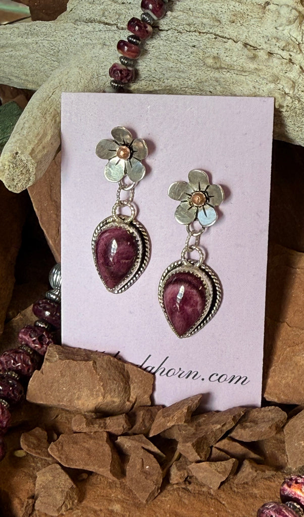 Sterling silver flower with copper accents and sterling silver post with purple spiny pear set in fine and sterling silver.