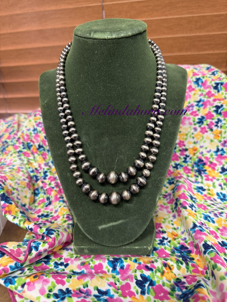 Cowgirl Pearls are Hand strung , antiqued Beads are sterling silver. Lobster clasp. Beads range in sizes from 6 mm 8. Sold as one strand in either 16”,18”, 20”, 22, or 24” inch.