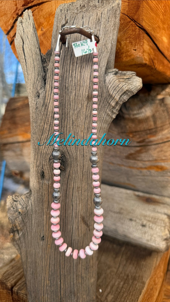 16 1/2” hand strung pink conch and corrugated sterling silver beads. Sterling lobster clasp and my makers mark tag.