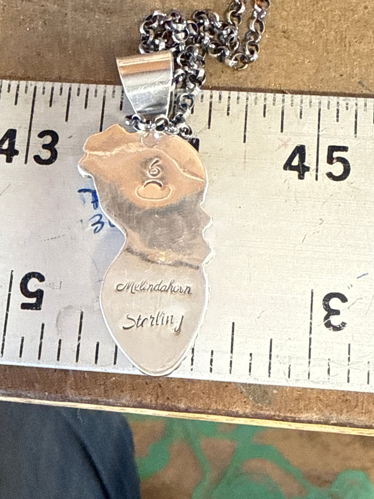Red spiny oyster shell set in fine and sterling silver. My makers mark and sterling stamped on back. Sterling silver antiqued chain 20”. Engraved bail accommodates 7 mm beads