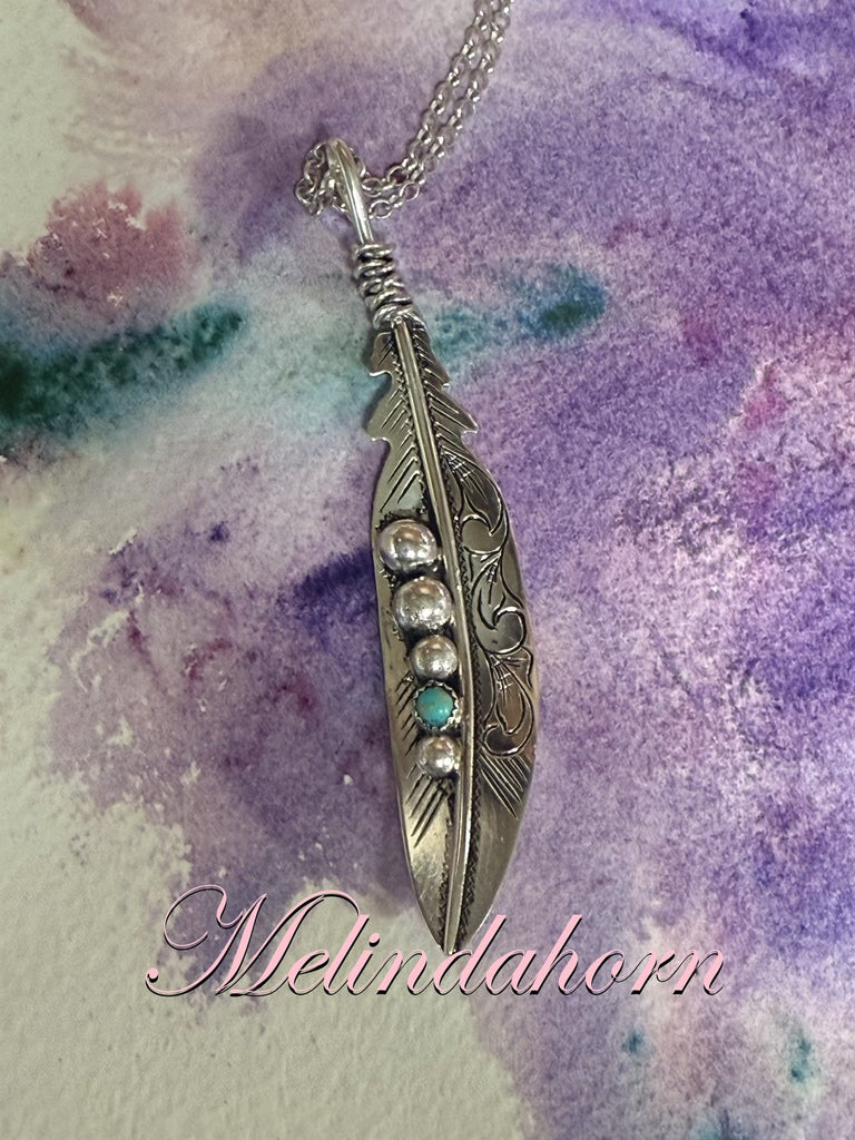 3 3/4” sterling silver engraved feather pendant. Sterling silver chain is 20”. Kingman turquoise for accent