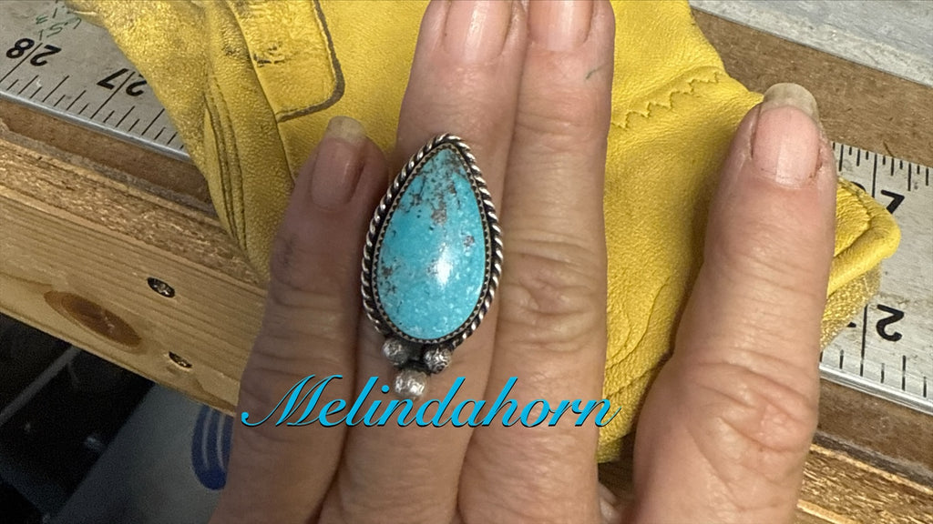 Kingman turquoise set in sterling on a size 9 sterling band. All sales final on rings no resizing