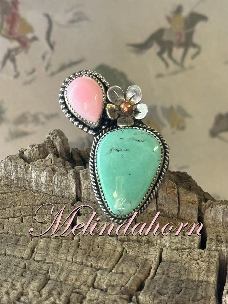 Cactus green. Turquoise Prickly Pear Paddle with a Pink Conch fruit and flower. Fine and Sterling silver setting with a split shank sterling size 9. All sales final on rings. No exchange or return. No resizing