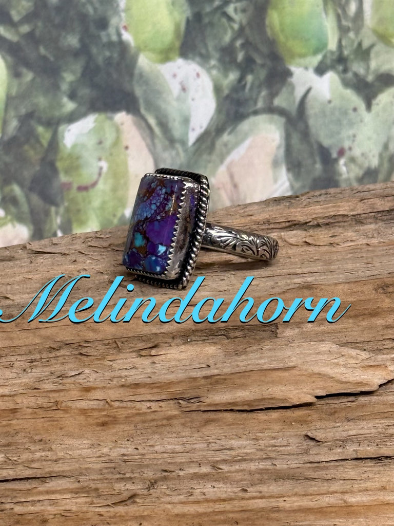 Purple Mohave set in fine and sterling silver on a pattern band sterling size 10 band. All sales final on rings. No resizing