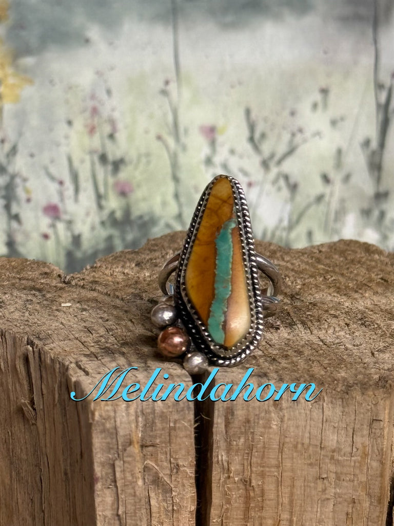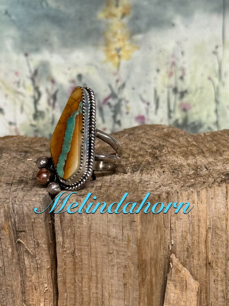 Cool Royston Ribbon turquoise set with fine and sterling silver and copper. Split shank size 7 all sales final on rings. No resizing