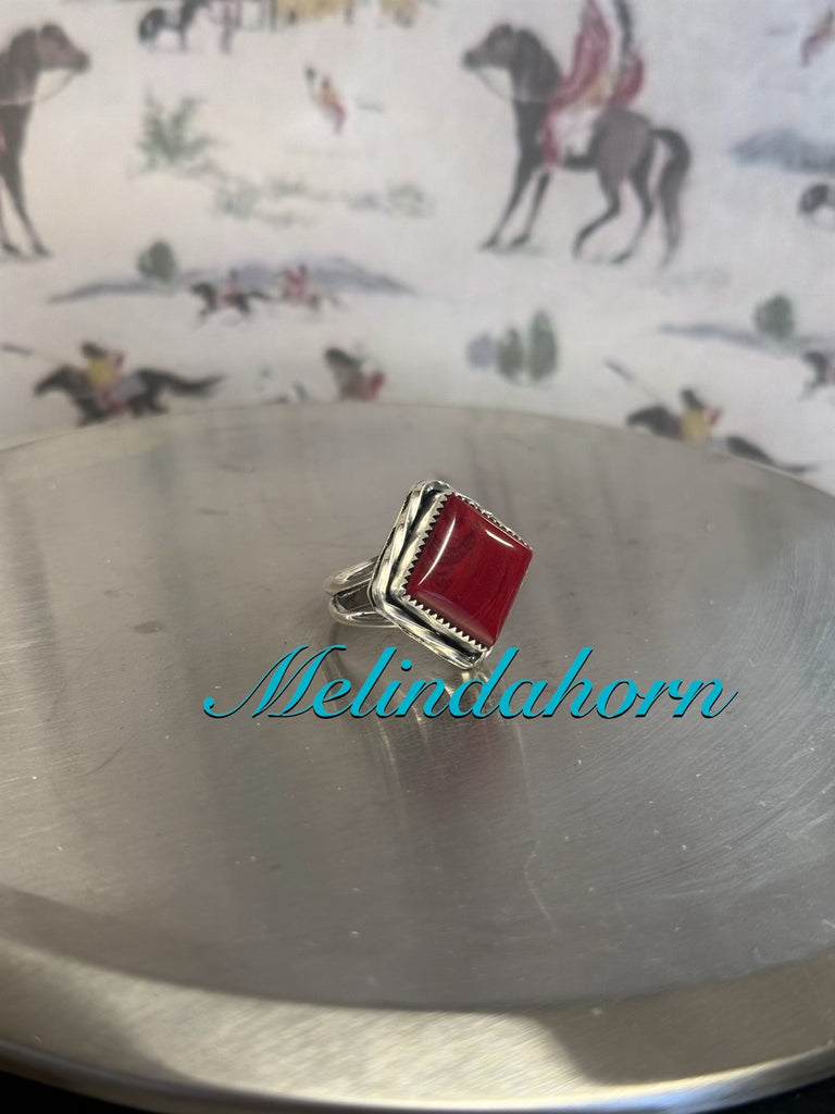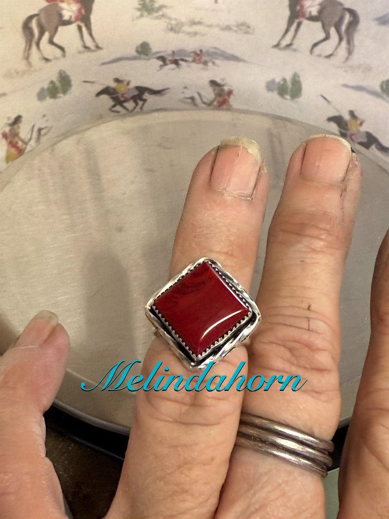 Red Rosarita square set in fine and sterling silver with sterling accents. Size 6 1/2 sterling silver double shank band.
