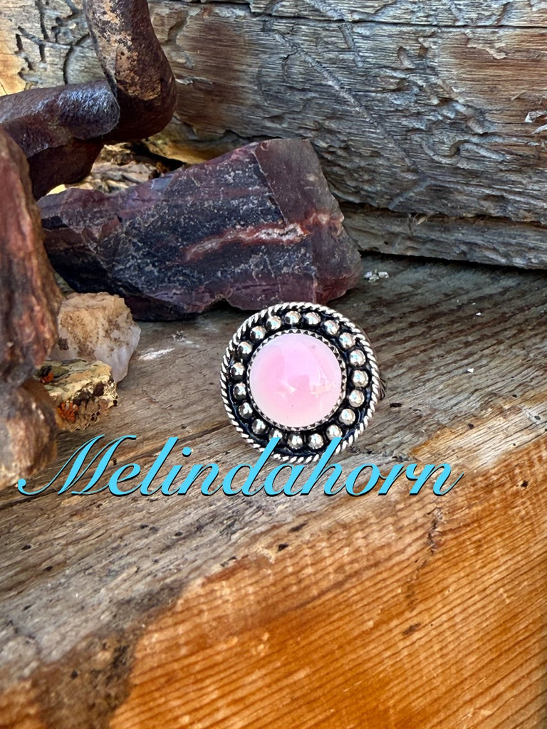Pretty pink conch shell round set with 2 types of sterling wire on a floral pattern band size 8 1/2. All sales final on rings. No resizing
