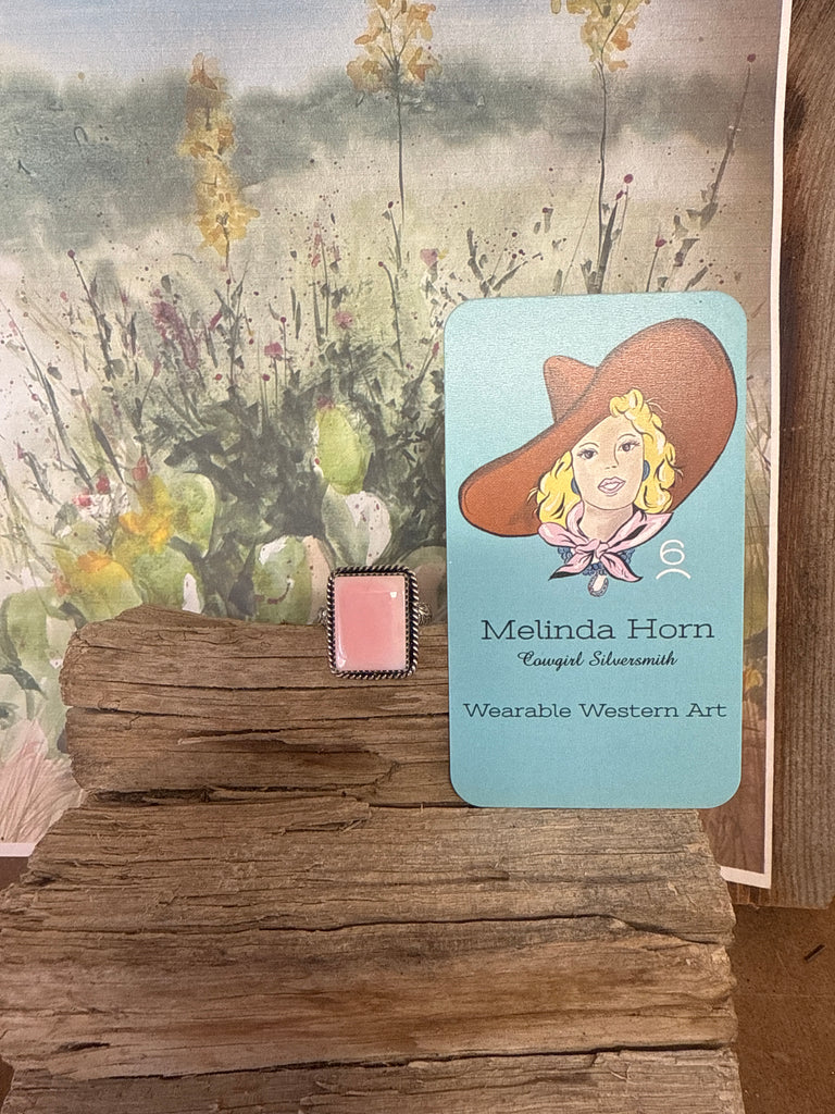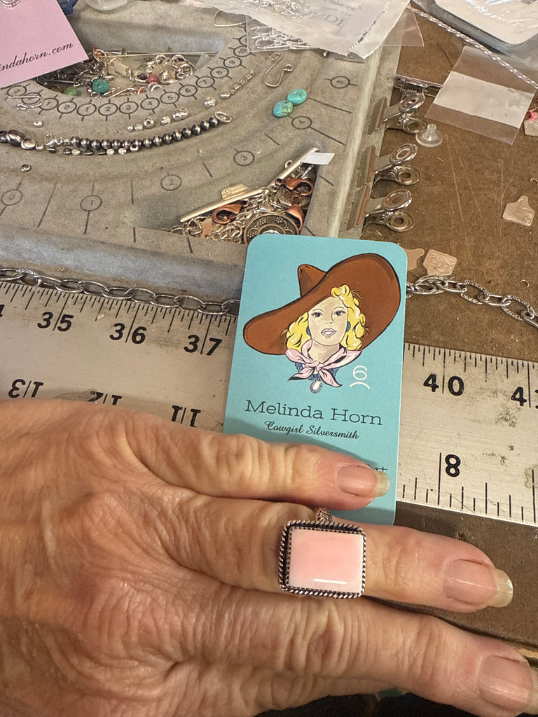 Pretty pale pink conch set in sterling and fine silver. Floral band sterling size 9. All sales final on rings. No resizing