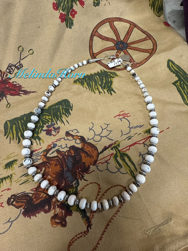 17 1/2” hand strung White Buffalo beads with sterling silver saucer beads. Lobster clasp.