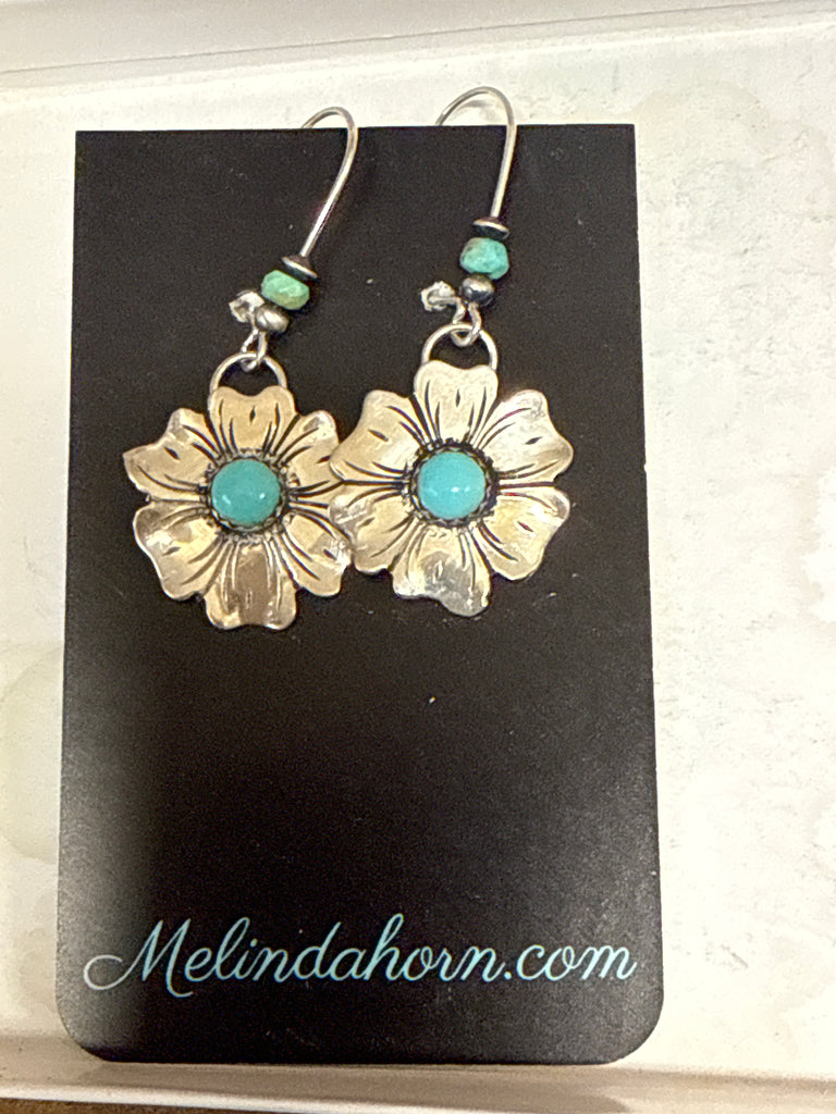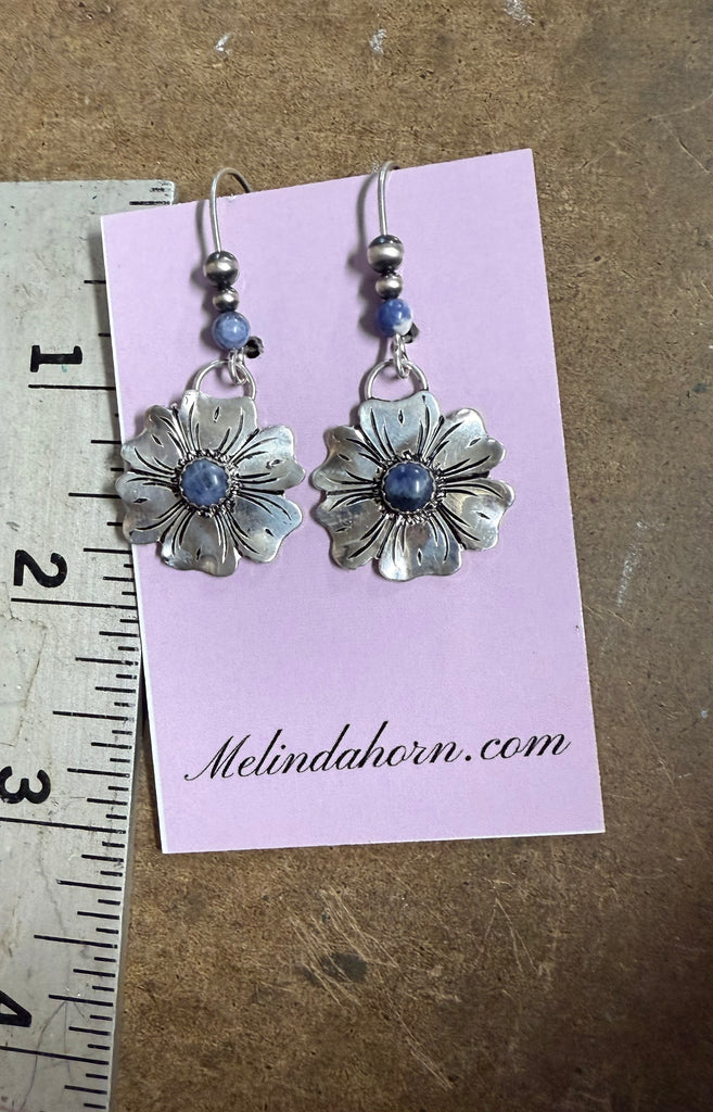 3/4” western flower. Sterling silver engraved with Lapis accents centers. sterling silver ear wires.