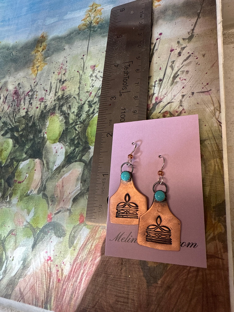 3/4” x 1” copper cow tag with stamped boot stitch. Kingman turquoise. 1/2” sterling ear wire