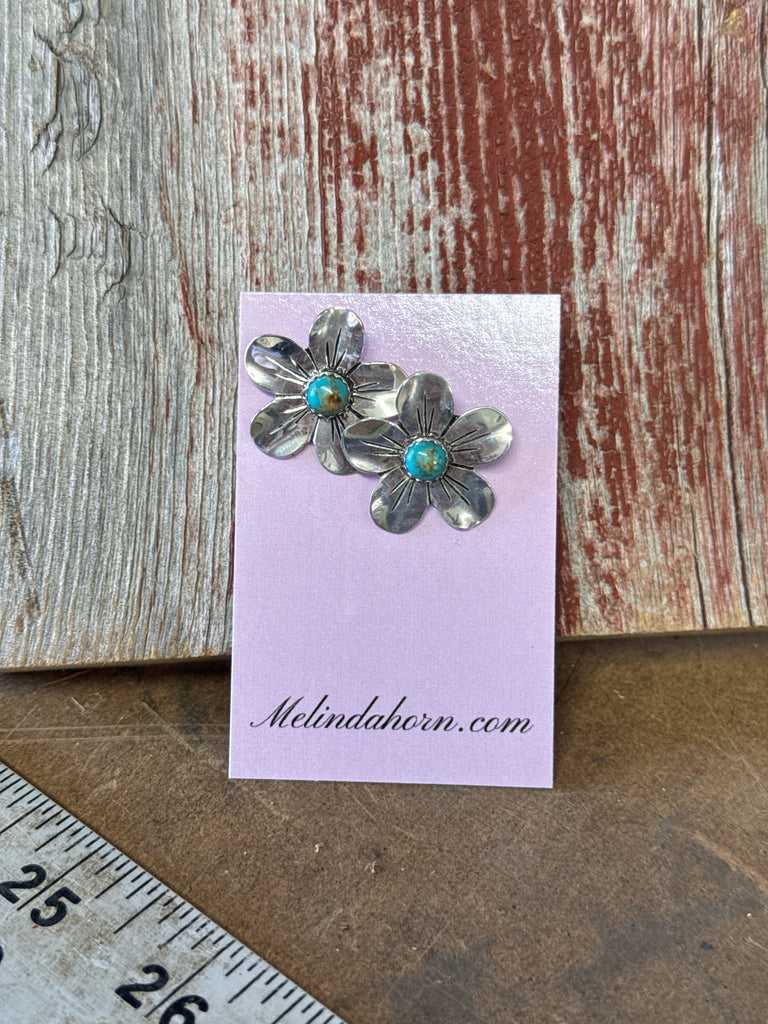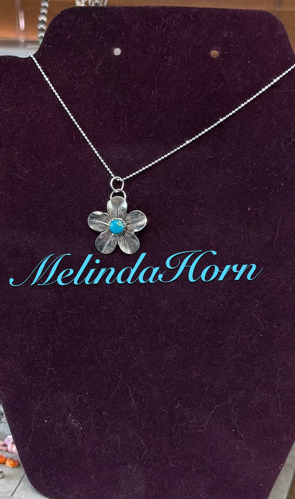 1” sterling silver engraved MC Forget Me Not flowers. Sterling silver ear wires and 16” chain