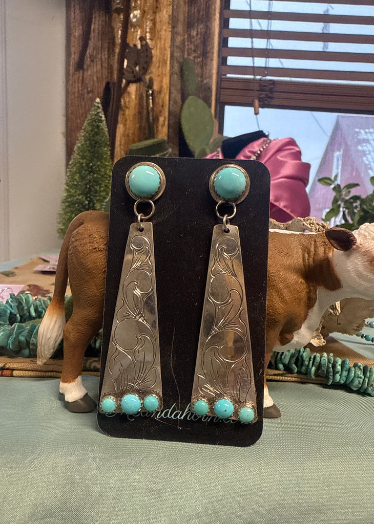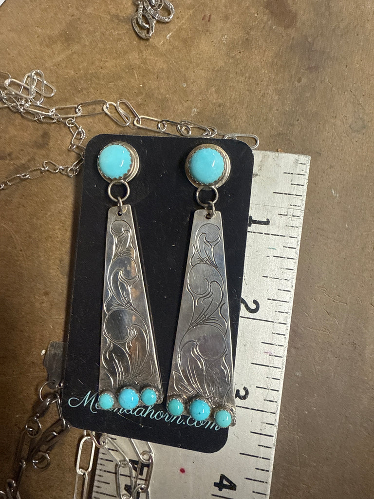 Sterling silver and Kingman turquoise. Engraved. Post back, sterling silver Originally $210 marked down to $140